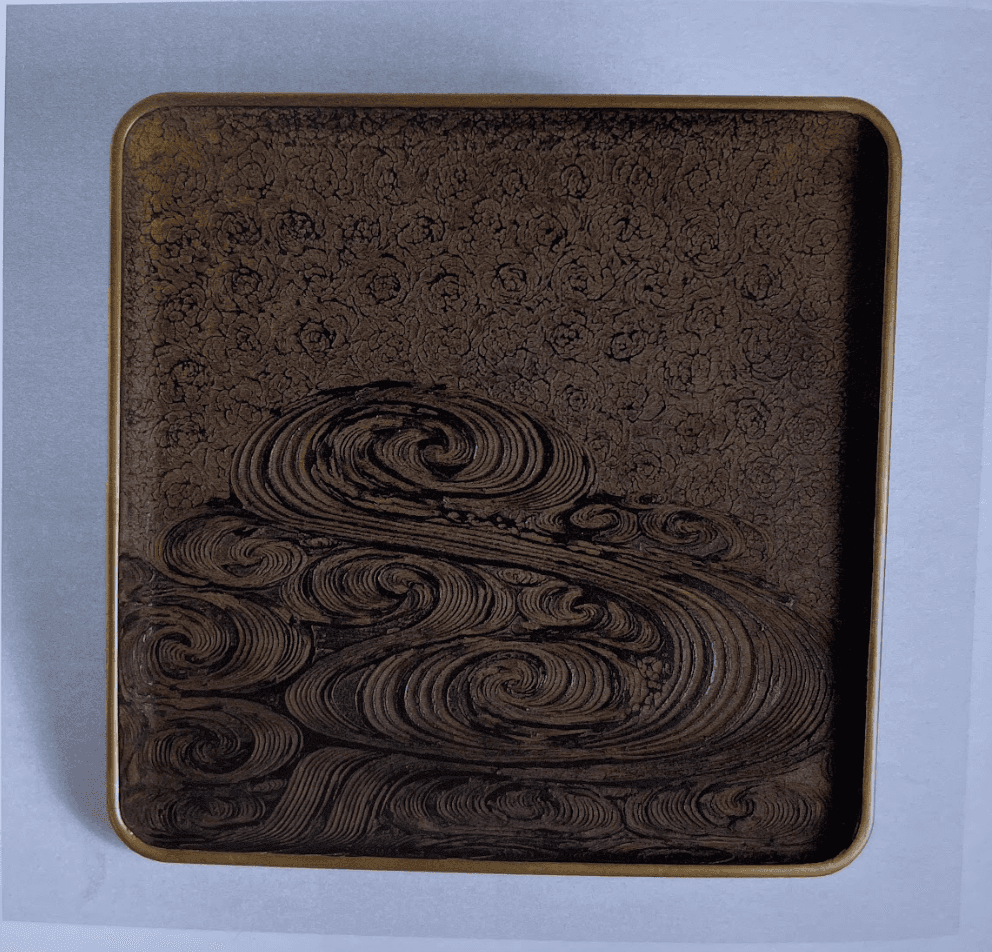 Estas piezas se remontan a la era Bunkyū 文久 (1861-1864) del periodo Edo (1603-1868). En el patrón decorativo, la textura de la parte superior de las bandejas fue lograda mezclando laca con clara de huevo o ranpaku 卵白, mientras que las olas fueron creadas con laca y un tipo de tierra o arena muy ligera para imitar, con texturas, la sensación de una corriente de agua. Esto permite que la laca se seque completamente aún con la adición de mayor volumen, ya que sin un material terroso las capas de laca iniciales corren el riesgo de no secarse del todo.