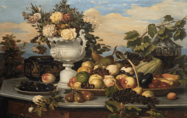 Este fastuoso bodegón de Josefa Sanromán (Santa María de los Lagos, Jalisco, 1829 - Ciudad de México, 1889), una de las pintoras mexicanas más relevantes del s. XIX, condensa inigualablemente la noción de abundancia que tan presente estuvo en las naturalezas muertas del romanticismo decimonónico, especialmente en aquellas influenciadas por el retorno del rococó.