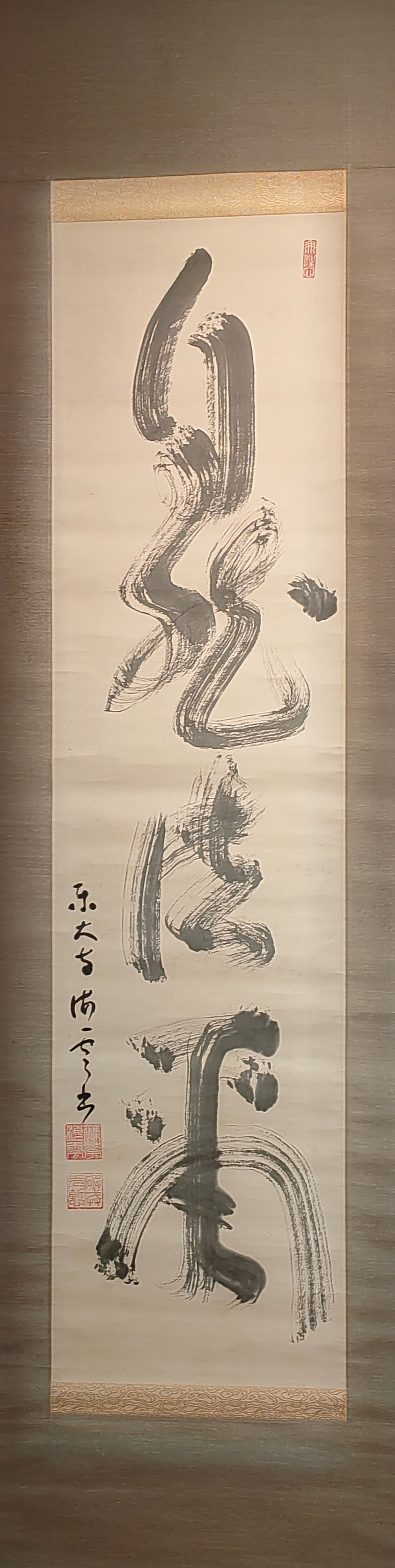 Hanging scrolls (kakejiku 掛軸) like this one served a variety of functions. In Buddhist contexts, they were often used as tools for meditation or as exercises for the training of disciples. Other times, they were commissioned or displayed in the tokonoma 床の間—a recessed alcove in shoin-style 書院 rooms designed for the appreciation of art objects—during tea ceremonies, or to create a fitting atmosphere for receiving guests.