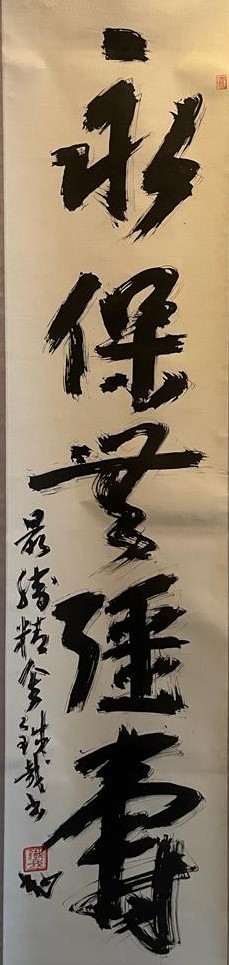 This semi-cursive calligraphy, with energetic and angular strokes, was likely created during Tessai’s time at the Buddhist temple. The phrase he transcribes may have been taken from one of the verses in the Chinese poem, Ten Poems Offered for Eternal Life on a Spring Day 春日奉獻聖壽無疆詞十首, composed by Yang Juyuan 楊巨源 during the Tang dynasty 唐.