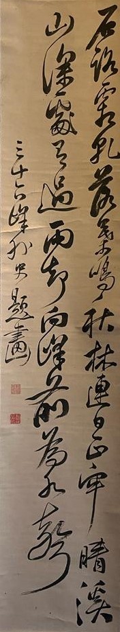 Con una pincelada experta y madura, esta escritura cursiva encadenada de Rai San’yō presenta un poema chino que describe un paisaje otoñal en lo profundo de las montañas, en un ejercicio que evoca la composición de una pintura.