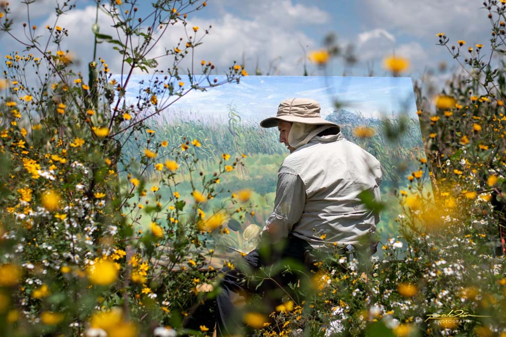 Las flores de otoño comienzan a salir, anunciando el fin del ciclo agrícola y la llegada de los santos difuntos. Este cuadro lo realicé al final de la época de lluvias, cuando está listo el maíz para ser cosechado. Lo pinté a finales de septiembre en una fecha próxima a la fiesta de san Miguel Arcángel; durante la celebración se colocan cruces hechas con flor de pericón, las cuales alejan a los malos espíritus y al fuerte viento que destruye la milpa.