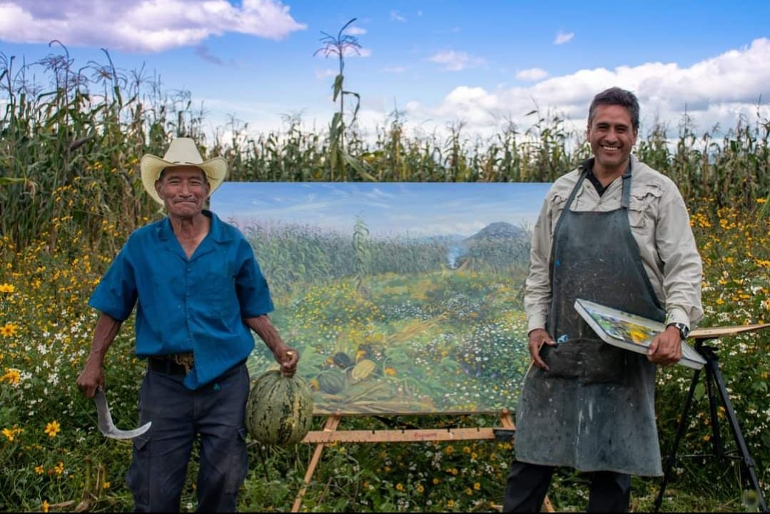 Don Severiano es un campesino de más de 75 años que todos los días trabaja su milpa a mano, ayudado por sus animales. Lo conocí en mis recorridos por el pueblo de Cocotitlán y le pedí que me invitara a la cosecha de su milpa para plasmar este momento de fiesta después de muchos meses de arduo trabajo. Llegué por la mañana, fueron poco más de ocho horas pintando dentro de la milpa y conviviendo con el campesino de manos agrietadas y cuerpo encorvado, pero con una gran sonrisa en su rostro y un espíritu y una fortaleza pocas veces vistos. El motivo parecería muy monótono, pero dentro de su milpa él me mostró la gran riqueza y el simbolismo de cada elemento. Al fondo tiene su arcina, un almacén de rastrojo de maíz para acopiar el alimento de sus animales. Me armó un pequeño atado con varas de maíz para mostrarme el inicio —o corazón— de cómo se forma un mogote; tenía entre los surcos guías de calabazas, con sus flores, y de ololiuqui, una enredadera con flores moradas en forma de campanas, asociadas con Quetzalcóatl y Tláloc.