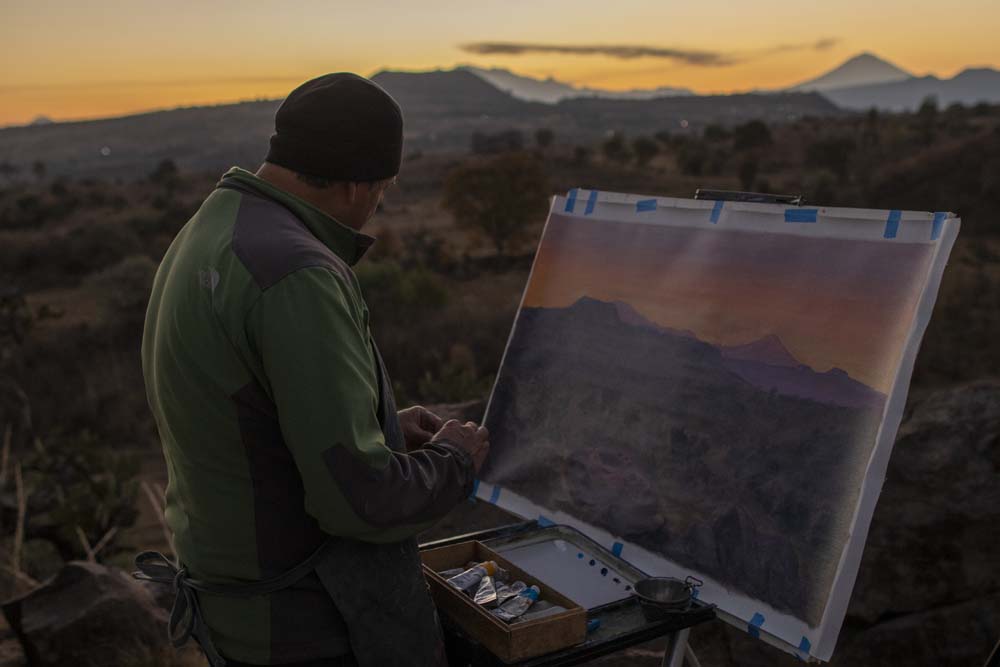 Pinté este amanecer en el solsticio de invierno, el 21 de diciembre de 2022, desde la piedra con pocitos, ubicada a un costado del camino real que comunica a Xochimilco con San Bartolo Xicomulco, en Milpa Alta. En esta zona existen varias piedras con petrograbados y chicallis, que fueron utilizadas para ofrendar a Tláloc durante la petición de lluvias y en agradecimiento por la cosecha. Este adoratorio está alineado con la salida del Sol sobre el Popocatépetl en el solsticio de invierno y guarda una relación precisa con el calendario de horizonte, conformado por los volcanes Iztaccíhuatl, Popocatépetl, Papayotl, Telapón, Tláloc y Teuhtli.