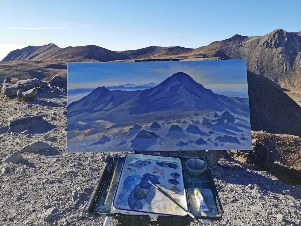 Pinté este cuadro como una forma de entender el espacio y comprender el movimiento del Sol y la Luna respecto al volcán, así como los sitios de adoración y las vistas desde ellos hacia el horizonte. También realicé varios apuntes del espacio in situ para registrar el paso del Sol y estudiar las vistas a más de 4,300 m de altura, lo cual no fue sencillo debido al viento, el frío y el ascenso, que muchas veces implicaba caminar más de una hora para llegar a cada sitio.